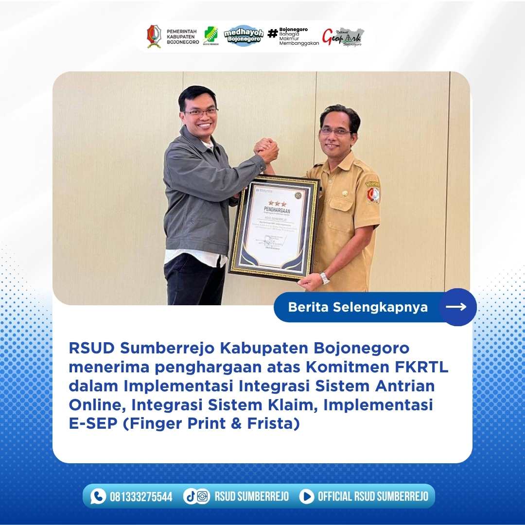 RSUD Sumberrejo Kabupaten Bojonegoro menerima penghargaan atas Komitmen FKRTL dalam Implementasi Integrasi Sistem Antrian Online, Integrasi Sistem Klaim, serta Implementasi E-SEP (Fingerprint & Frista).Penghargaan ini...