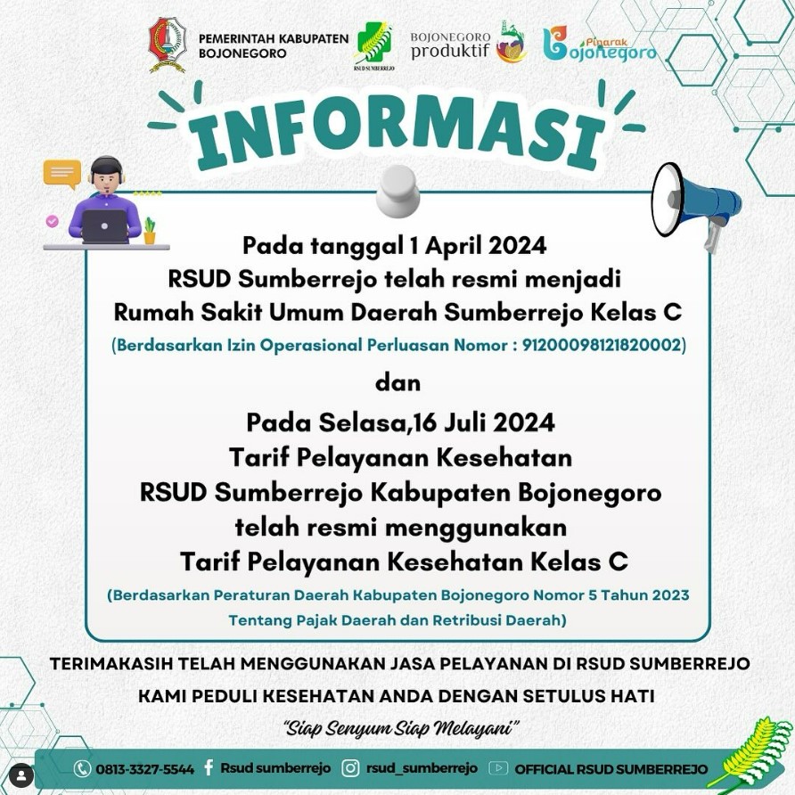 Informasi untuk Sobat Sehat RSUD Sumberrejo bahwa pada tanggal 1 April 2024 RSUD Sumberrejo sudah resmi menjadi RSUD Sumberrejo Kelas C dan pada tanggal 16 Juli 2024 tarif pelayanan kesehatan telah resmi menggunakan tarif Pelayanan Kesehatan kelas C.