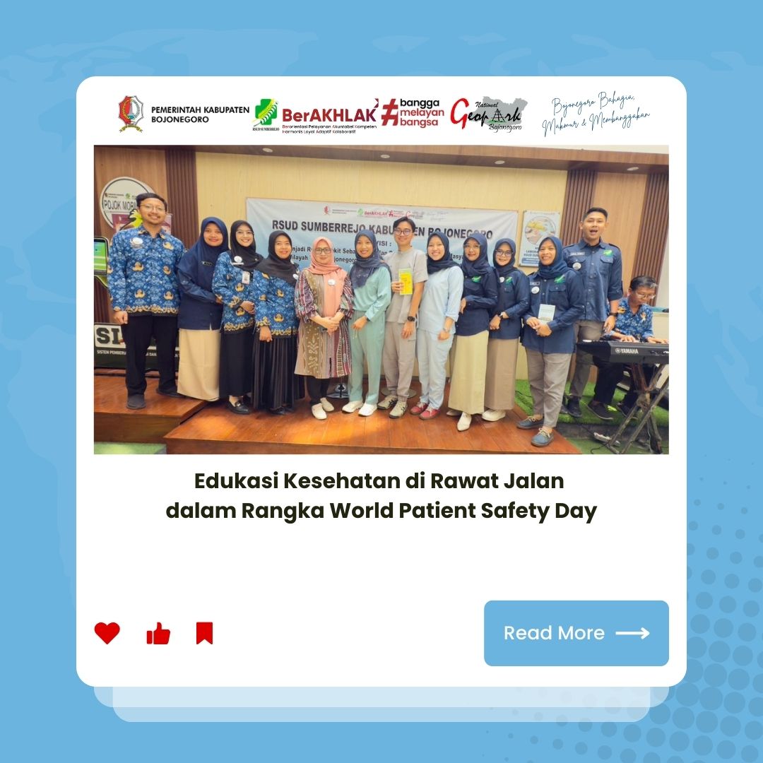 Dalam rangka memperingati World Patient Safety Day yang jatuh pada tanggal 17 September, Komite Promosi Kesehatan Rumah Sakit (PKRS) berkerjasama dengan Komite Mutu RSUD Sumberrejo menyelenggarakan kegiatan edukasi kesehatan di Rawat Jalan dengan tema “Safe Care For Every Newborn and Every Child” atau “Perawatan Aman Bagi Setiap Bayi Baru Lahir dan Setiap Anak”