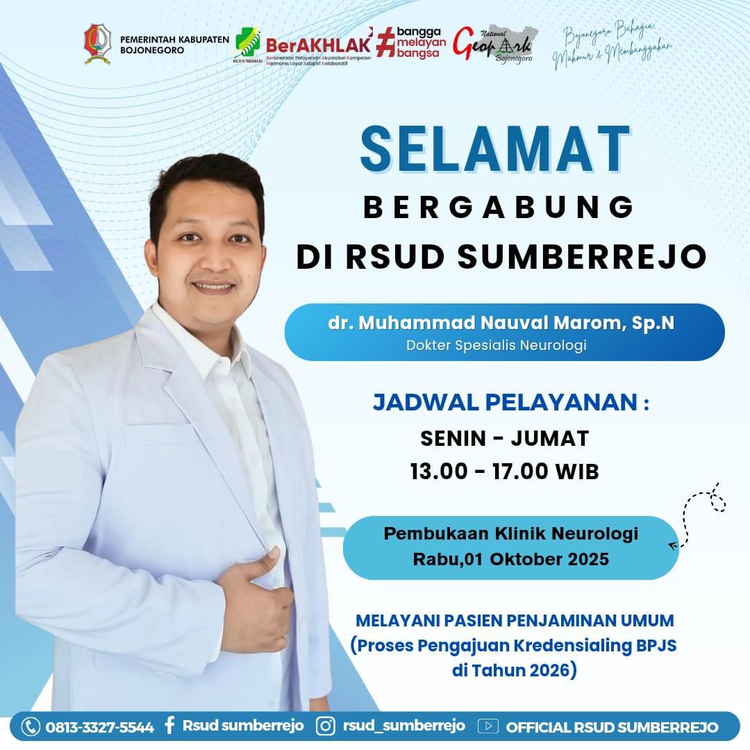 Pelayanan Klinik Neurologi ditangani oleh dr. Muhammad Nauval Marom, Sp.N dengan jadwal pelayanan Senin sampai Sabtu, pukul 13.00 - 17.00 WIB. Pelayanan Neurologi saat ini masih melayani pasien dengan penjaminan umum, untuk pasien dengan penjaminan BPJS dalam proses pengajuan kredensial BPJS pada tahun 2026 mendatang. Hadirnya Klinik Neurologi ini menjadi wujud komitmen RSUD Sumberrejo dalam meningkatkan mutu dan aksesibilitas layanan kesehatan bagi masyarakat. Dengan dokter spesialis dan fasilitas yang tersedia, kami siap memberikan pelayanan yang cepat, tepat, dan terpercaya untuk kesehatan Anda. Informasi, saran dan masukan terkait Pelayanan Klinik Neurologi silahkan bisa menghubungi Hotline SIPIPIT 081333275544 atau PIPP 085179767911 (st/nn)