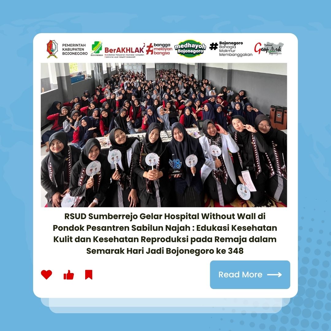 Dalam rangka memperingati Hari Jadi Kabupaten Bojonegoro ke-348, RSUD Sumberrejo melaksanakan kegiatan Hospital Without Wall (HWW) yang kali ini digelar di Pondok Pesantren Sabilun Najah, Simorejo - Kanor, dengan mengusung tema “Sehatkan Generasi, Cegah Sejak Dini — Kesehatan Kulit dan Kesehatan Reproduksi pada Remaja.”