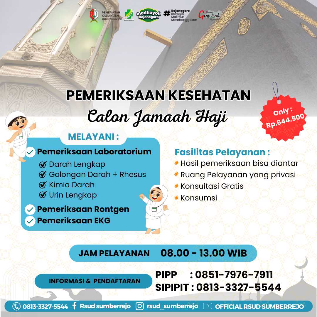 RSUD Sumberrejo membuka pelayanan kesehatan untuk calon jamaah haji tahun 2026 dengan rincian pemeriksaan meliputi :