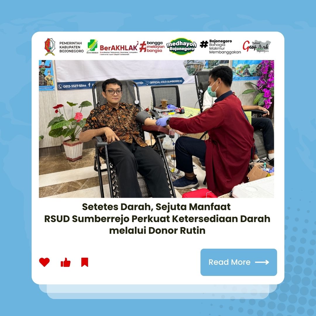 RSUD Sumberrejo kembali melaksanakan kegiatan donor darah rutin yang digelar setiap dua bulan sekali sebagai bentuk komitmen rumah sakit dalam mendukung ketersediaan stok darah di UDD PMI Kabupaten Bojonegoro. Kegiatan ini berlangsung di Ruang Pertemuan Paripurna Lantai 6 RSUD Sumberrejo dan diikuti oleh tenaga kesehatan, pegawai rumah sakit, serta masyarakat umum yang turut berpartisipasi sebagai pendonor.