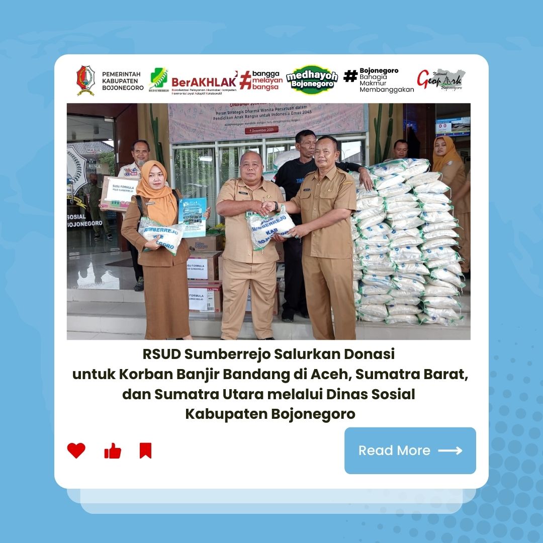 Sebagai bentuk kepedulian terhadap masyarakat yang terdampak bencana banjir bandang di wilayah Aceh, Sumatra Barat, dan Sumatra Utara, RSUD Sumberrejo menyalurkan bantuan kemanusiaan melalui Dinas Sosial Kabupaten Bojonegoro. Donasi yang diberikan berupa paket bahan pokok dan susu formula untuk mendukung pemenuhan kebutuhan dasar para korban.