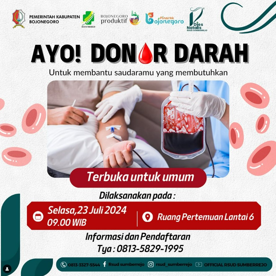 Yuk catat tanggalnya Selasa,23 Juli 2024 dilaksanakan kegiatan Donor Darah di Ruang Pertemuan Paripurna. Kegiatan ini terbuka untuk umum loo. Segera daftarkan...