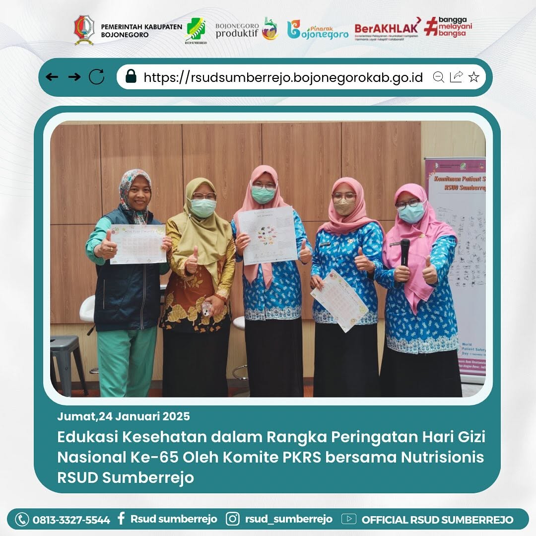 Edukasi Kesehatan dalam Rangka Hari Gizi Nasional ke-65 yang diselenggarakan oleh Komite PKRS bersama dengan Instalasi Gizi RSUD Sumberrejo. Edukasi ini mengusung...